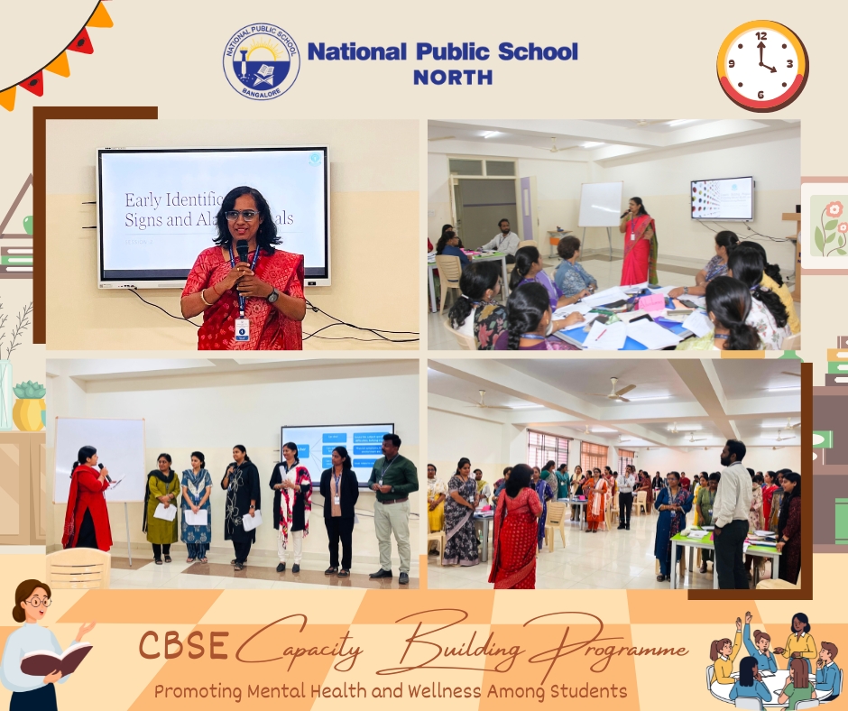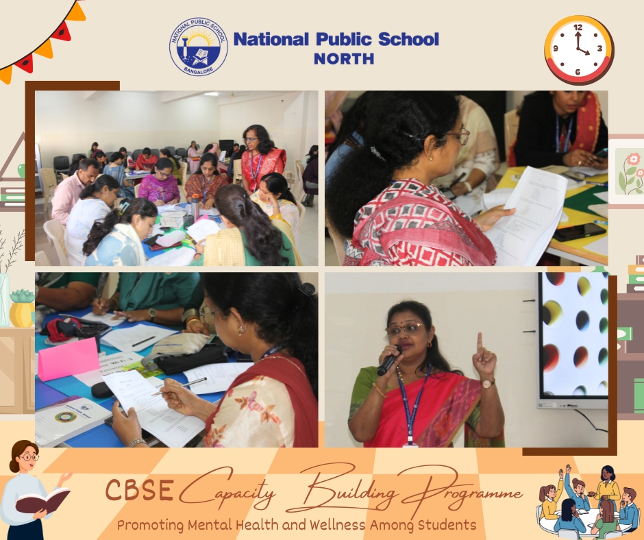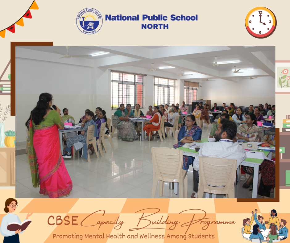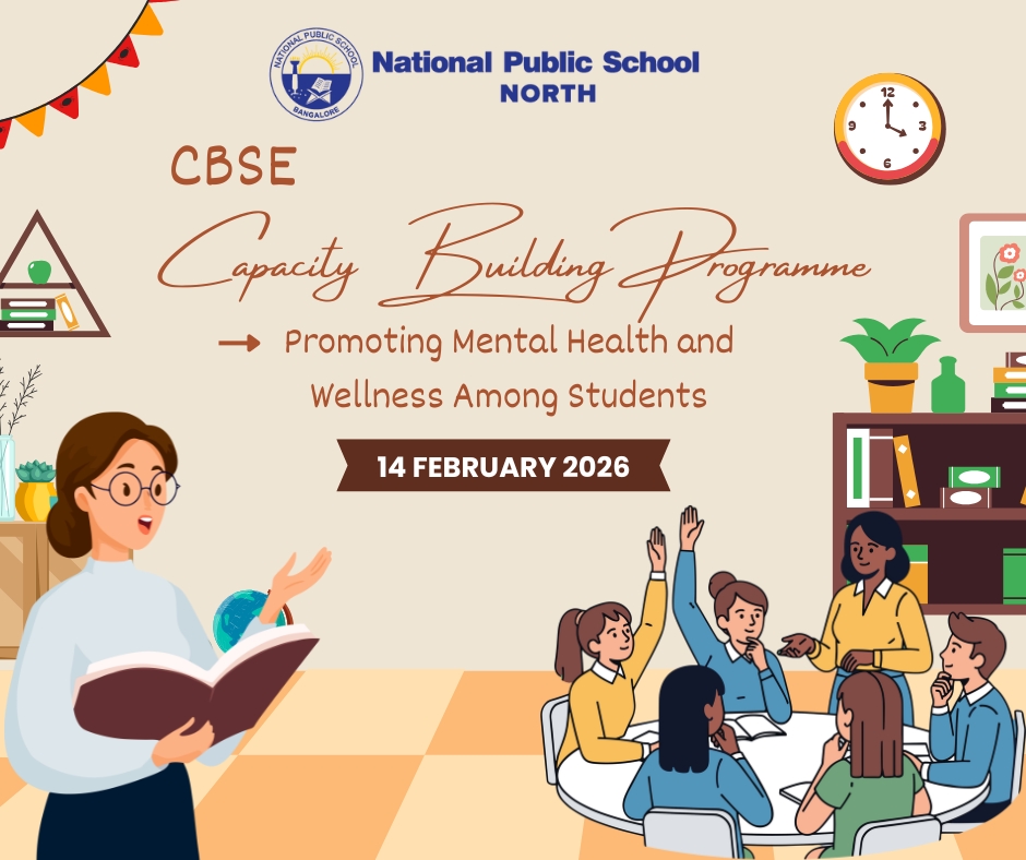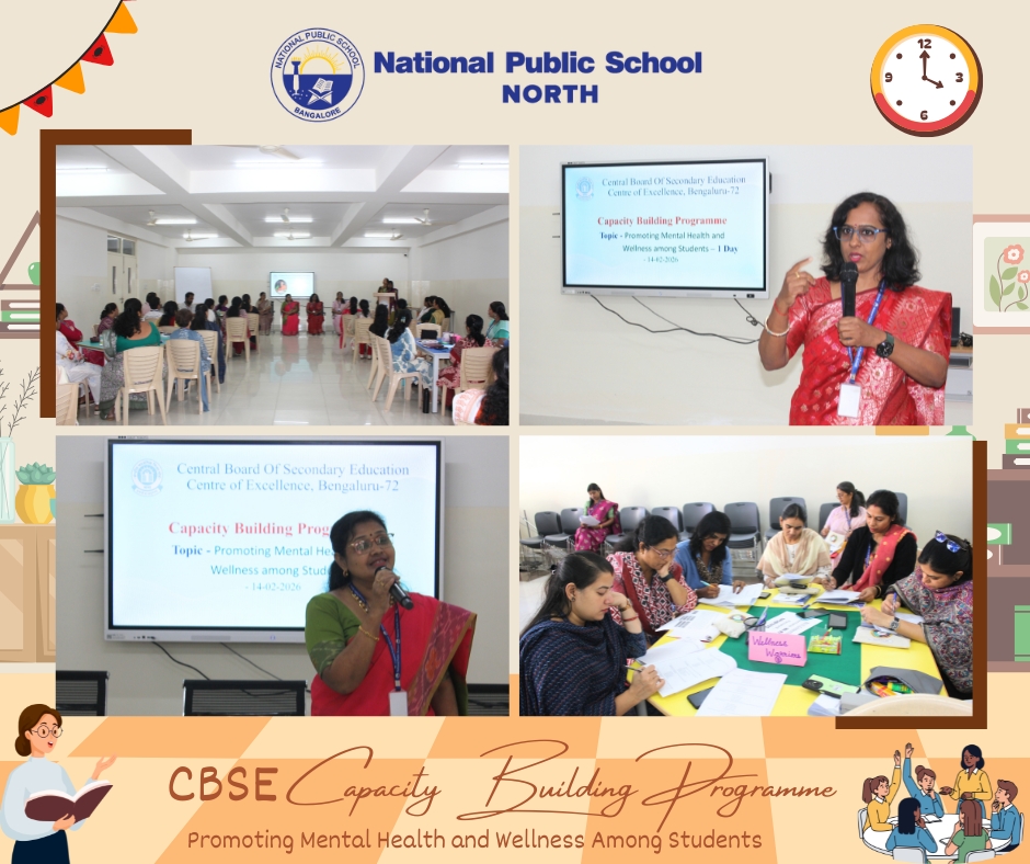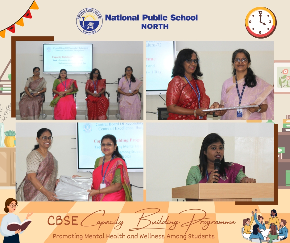 On 14 February, 2026, faculty members from National Public School, NORTH, took part in a Capacity Building Programme designed to enhance the promotion of Mental Health and Wellness Among Students. This valuable session was led by esteemed CBSE Resource Persons, Ms. Renu Elizabeth Benny and Ms. Sreevidya M. The primary goal of the programme was to empower teachers with knowledge about the identification, prevention, promotion, and management of Mental Health and Wellbeing through a Whole School Approach.